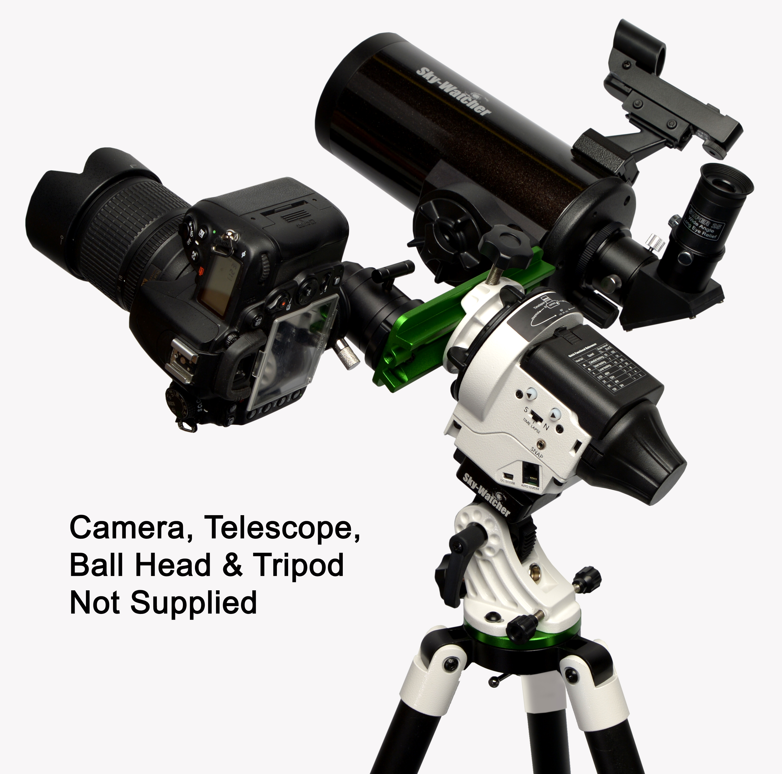 The Star Adventurer can attach to any standard tripod via its ?`` or 3/8`` adaptors. The latitude can be set by either adjusting the tilt of your tripod head to match your latitude or more accurately with the included Equatorial Wedge. To fit a camera to the Star Adventurer, either a tripod Ball Head can be fitted (not supplied) or to the supplied Dovetail L-Bracket. The Dovetail L-Bracket used in conjunction with the optional counterweight shaft/counterweight also allows small telescopes (e.g. Skymax-90), with a ?-20 tripod fitting, to be used with the Star Adventurer. By dispensing with the counterweight shaft, a small telescope and camera (using a ball head, not supplied) can be mounted simultaneously on the Dovetail L-bracket. Using just the dovetail bar from the Dovetail L-Bracket, two cameras can be mounted at the same time using two tripod ball heads (not supplied).
