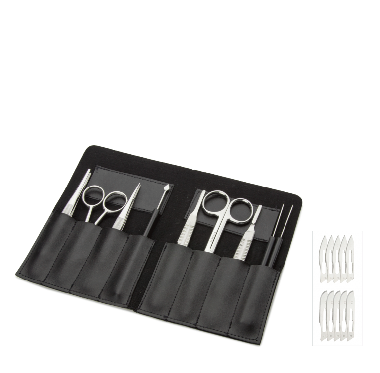 Komplektas su dviem tiesiomis skrodimo adatomisi, skrodimo adata, lanceto formos žnyplėmis, skrodimo žnyplėmis, žirklėmis, skrodimo žirklėmis, 2 skalpeliais, 5 skalpelio ašmenimis su tiesiu galu ir 5 ašmenimis su buku galu. Tiekiamas su dirbtinės odos dėklu