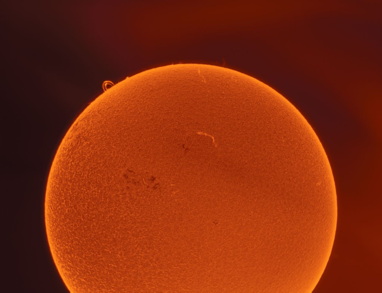 Saulė stebima ties 656 nanometrų bangos ilgiu (H-alfa emisinė linija), kuri rodo nuolat aktyvų Saulės paviršių ir išsikišimus Saulės pakraštyje. Visada yra ką pamatyti ant Saulės H-alfoje!!