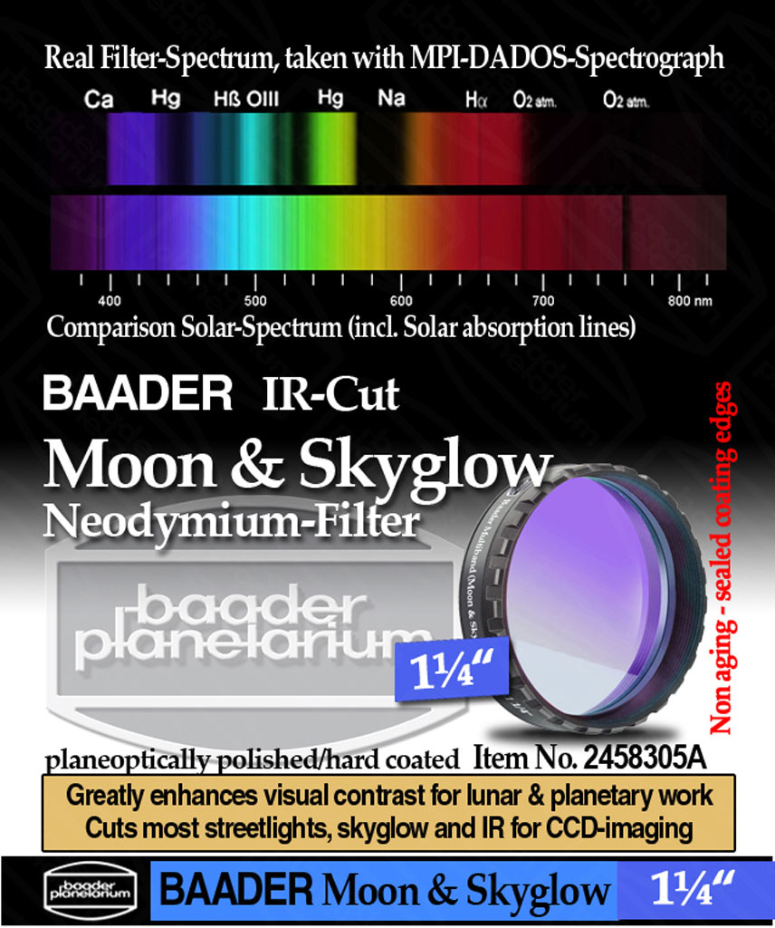 Nors tai ir ne `giliojo dangaus` filtras, jis pagerina galaktikų vaizdą, padidindamas jų kontrastingumą su dangumi. Spalvoti filtrai praleidžia tik nustatyto ilgio šviesos bangas, tuo tarpu šis filtras praleidžia didžiąją spektro dalį, blokuodamas tik keletą, žmogaus sukuriamų spektrinių linijų. Jei kada nors teko naudoti pigius spalvotus filtrus planetų stebėjimams ir nusivylėte, pabandykite šį gaminį. Objektai bus matomi žymiai natūralesnėmis spalvomis, o vaizdo kokybė nenukentės netgi esant dideliems didinimams. Dėl itin didelio pralaidumo, šis filtras tinkamas naudoti netgi su mažais teleskopais. Jei dar nematėte Jupiterio raudonosios dėmes, su šiuo filtru tikrai pamatysite. Taipogi galėsite pasižvalgyti po saulę (būtinai papildomai naudojant ir AstroSolar filtrą). Tinkamas naudoti su standartiniais okuliarais, o astrofotografijoje gali būti naudojamas kartu su Baader infraraudonųjų spindulių filtru. Filtras pagamintas iš sluoksninio Neodymium (lantanidų šeimos elementu Neodimiu praturtinto) stiklo. Kadangi filtras itin atsparus įbrėžimas, galite specialiomis priemonėmis valyti filtrą. Tai tiesiog kokybiškas bei nebrangus planetinis filtras.