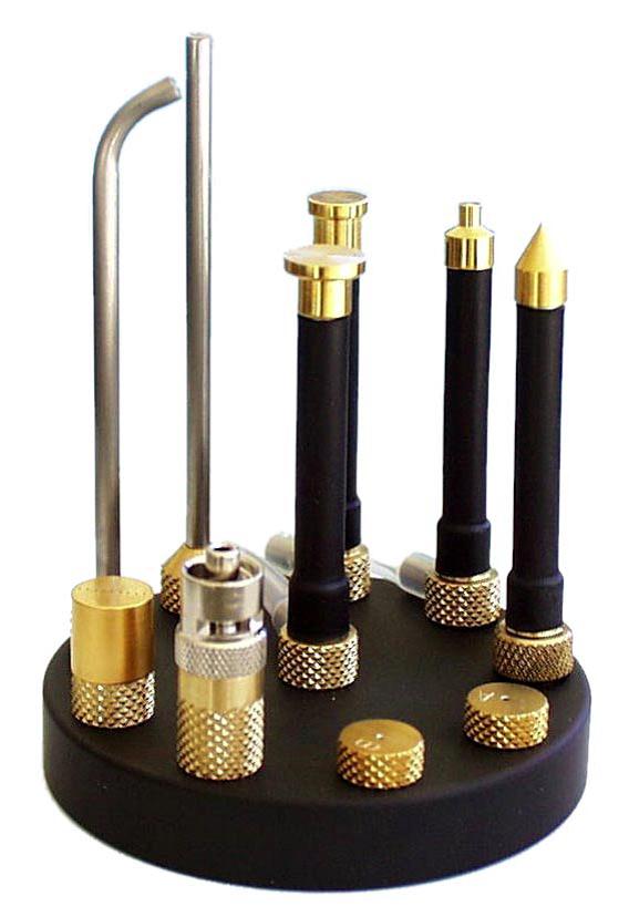 Purkštukų antgalių medžiaga: Varis. Angaliai: A (1 mm),B (0.75 mm),C (0.5 mm) ,D (0.45 mm), purkštukų valymo antgalis ir lenktas purkštukas. Plastikinis antgalių laikiklis.