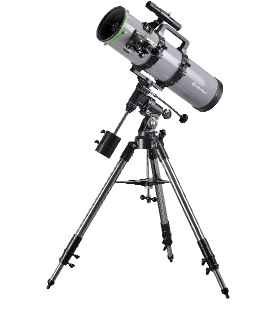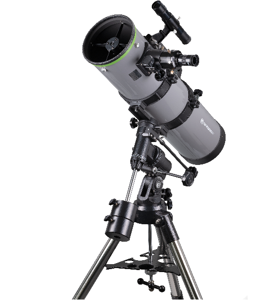 The BRESSER Space Explorer 150/750 telescope with an EQ-3 mount shows you the night sky in stunning detail. Go on a journey into distant worlds: Thanks to the combination of a large 150 mm aperture and a short 750 mm focal length, you can marvel at a vast array of celestial objects such as large nebula, open star clusters or the Andromeda galaxy. The powerful?Newton reflector telescope is also great for observing our own solar system: with the 25-mm Plossl eyepiece, you can view the moon in 30x magnification. The premium parabolic primary mirror produces significantly sharper images and better contrasts than a comparable telescope with a simple spherical mirror. In addition, the telescope also has a large 55 mm secondary mirror that illuminates the field of view perfectly to create a bright image.