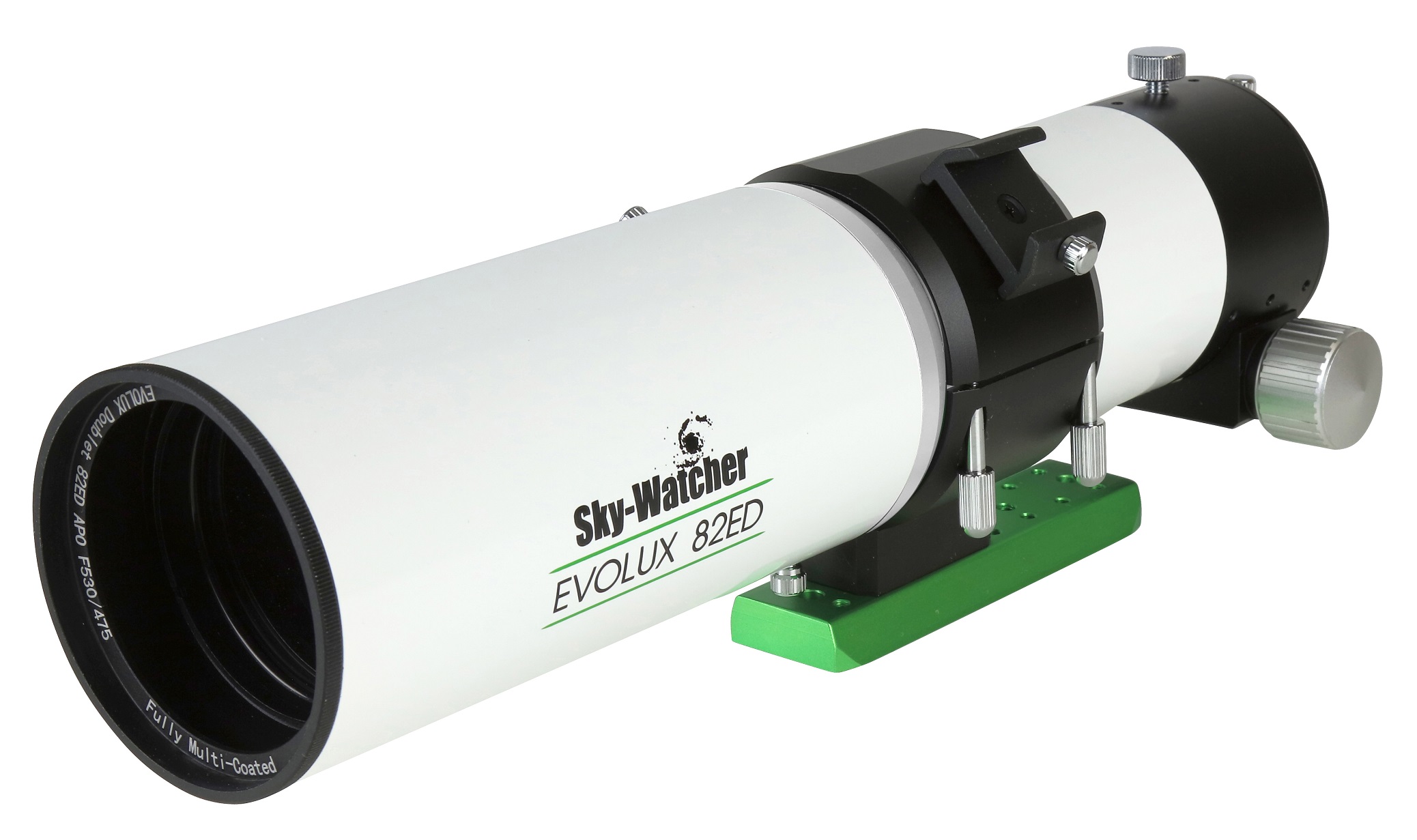 The Evolux-82ED comes in a foam-lined aluminum case with a 2.4-inch 11:1 dual-speed rack-and-pinion focuser, 45mm dovetail bar, clamshell ring, and adjustable dew shield. An optional 0.9x two-element focal reducer/field flattener, which includes one ED lens element and adaptor/field rotator is available separately, which when combined makes the Evolux-82ED into a four-lens optical system comprising two ED elements!