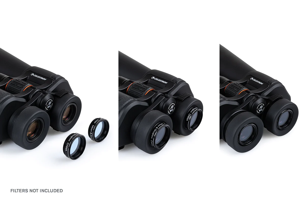 SkyMaster Pro ED eyepieces are threaded to accept standard 1.25`` astronomical eyepiece filters. Adding the right filter can deliver game-changing views for terrestrial and celestial observing. For terrestrial observation, filters can reduce the brightness of sand, snow, and water. For nighttime viewing, filters can cut glare, minimize eye strain, increase contrast, and even combat the effects of light pollution. Remember, the binocular needs a set of two filters.