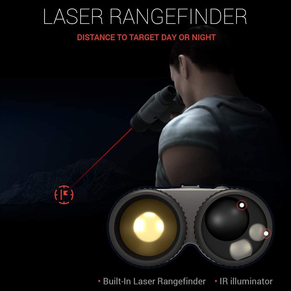 Binoculars have an Ultra sensitive Gen 4 sensor. Record and share your moments with a press of a button. Video files stored on an internal micro SD card. Laser rangefinder 1000 m distance to target day or night. We integrated a Laser Rangefinder, so you now have the ultimate binocular package that has everything you want. Not only do you have the ability to see both day and night at your fingertips, but you now have the ability to range your target with absolute accuracy for dope hold over or know how far you need to trek to your next waypoint.