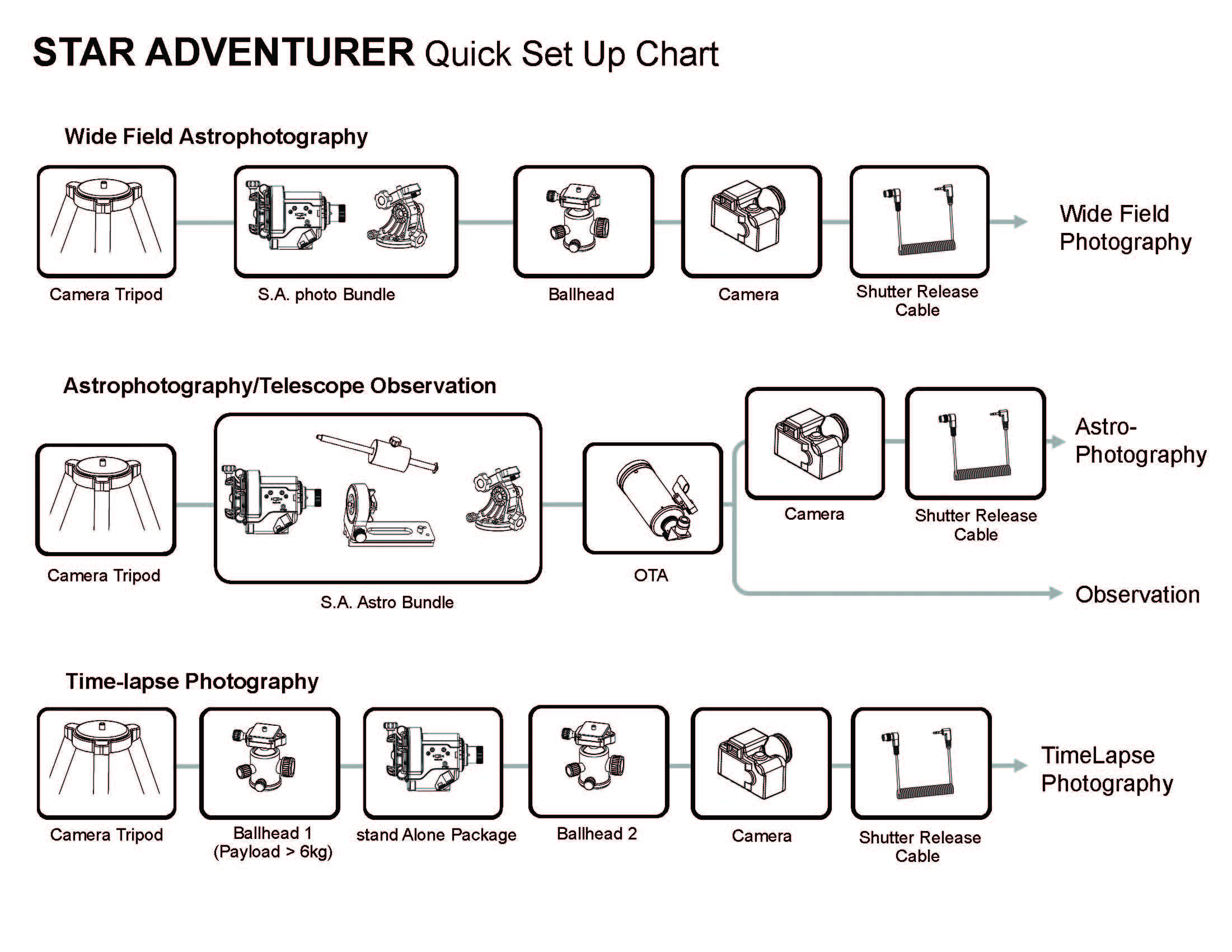 The Star Adventurer can attach to any standard tripod via its ?`` or 3/8`` adaptors. The latitude can be set by either adjusting the tilt of your tripod head to match your latitude or more accurately with the included Equatorial Wedge. To fit a camera to the Star Adventurer, either a tripod Ball Head can be fitted (not supplied) or to the supplied Dovetail L-Bracket. The Dovetail L-Bracket used in conjunction with the optional counterweight shaft/counterweight also allows small telescopes (e.g. Skymax-90), with a ?-20 tripod fitting, to be used with the Star Adventurer. By dispensing with the counterweight shaft, a small telescope and camera (using a ball head, not supplied) can be mounted simultaneously on the Dovetail L-bracket. Using just the dovetail bar from the Dovetail L-Bracket, two cameras can be mounted at the same time using two tripod ball heads (not supplied).