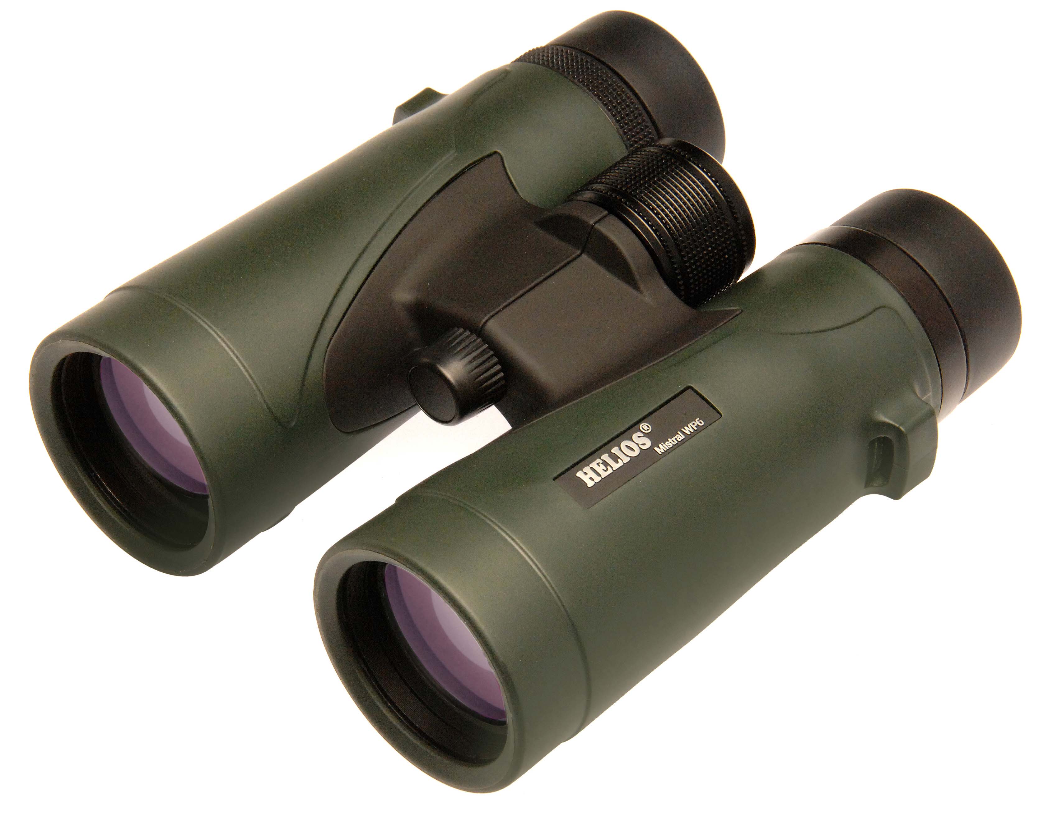 The new, highly specified Helios MISTRAL WP6 roof prism range comprises ten models over 32mm, 42mm and 50mm objective lens apertures. They are extremely competent instruments for both birdwatching & general observing, and represent truly amazing value. They feature a very stylish, ergonomic, modern top hinge design covered in sleek green rubber armouring. The body is constructed from lightweight but robust polycarbonate. All models feature high-index, silver-coated BaK-4 prisms and fully multi-coated optics which provide excellent optical performance. Images delivered are crisp and sharp, with very good resolution, brightness and depth of field, whilst maintaining colours to a natural level. Near focus capability of all models is 2.5m or less. Waterproof and nitrogen filled for clear, fog-free operation. Twist-up, 3?position eyecups with metal sub-structure. Suitable for spectacle wearers. Knurled metal, easy-grip 2-turn focusing knob. Integral tripod bush. Supplied with neck strap, eyepiece rainguard, objective lens caps and soft case.