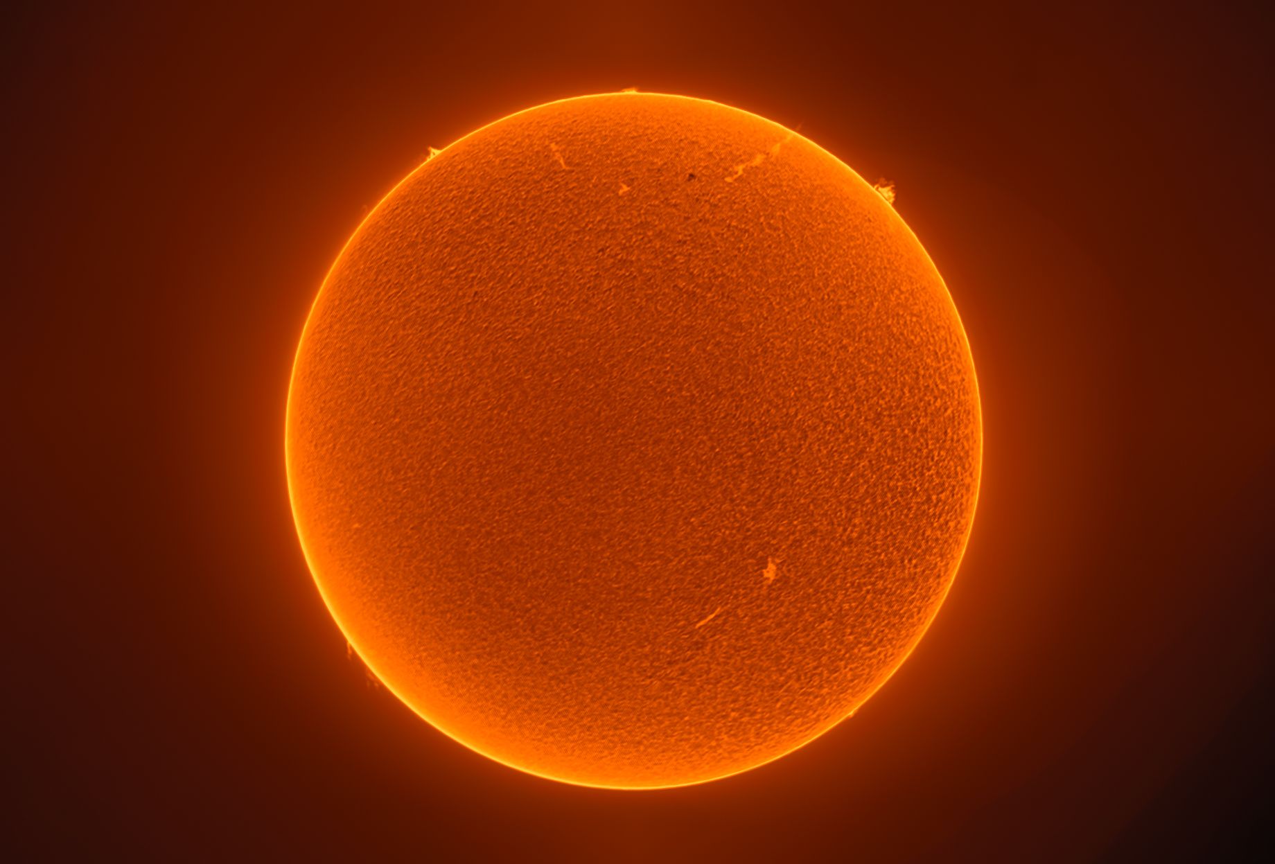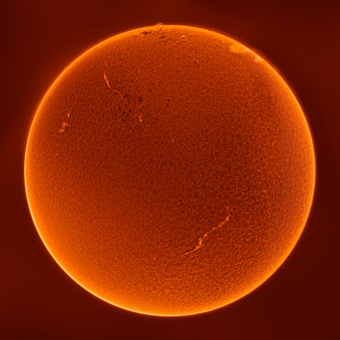 Saulė stebima ties 656 nanometrų bangos ilgiu (H-alfa emisinė linija), kuri rodo nuolat aktyvų Saulės paviršių ir išsikišimus Saulės pakraštyje. Visada yra ką pamatyti ant Saulės H-alfoje!!