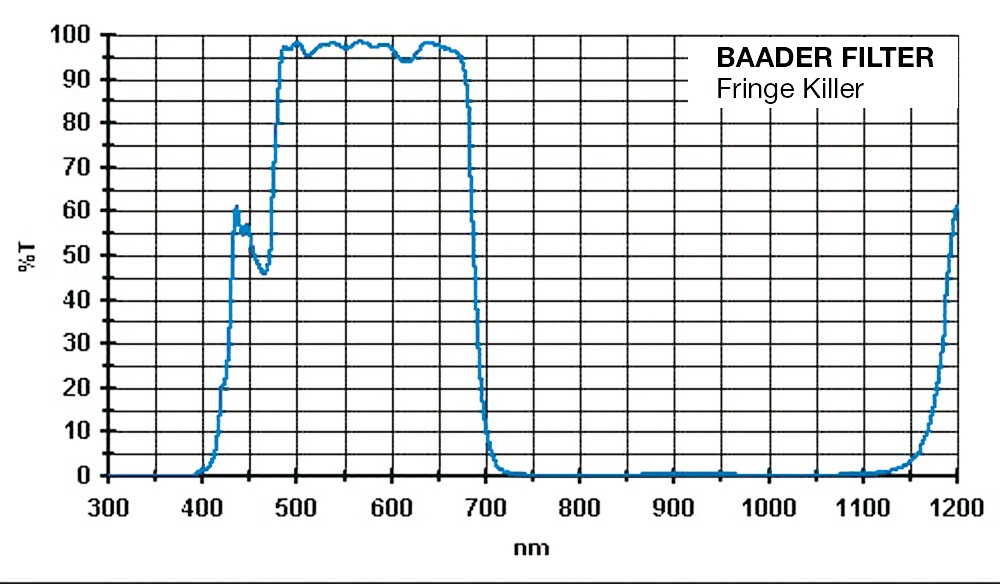 Baader Planetarium Fringe Killer filtras blokuoja nesufokusuotą šviesą raudonoje spektro dalyje (IR) iki 100%, bet, svarbiausia, slopina daugiau nei 50% trukdančios šviesos mėlyname spektro diapazone - nekeičiant spalvinio vaizdo pojūčio.